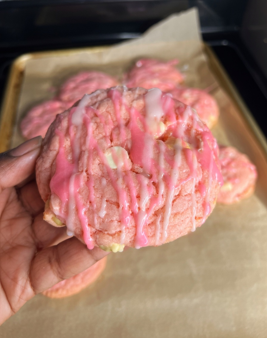 Drizzle both the white and pink glaze over the cooled cookies. Allow the glaze to set before serving.