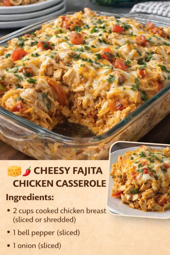 Cheesy Fajita Chicken Casserole Introduction This Cheesy Fajita Chicken Casserole is a Tex‑Mex inspired comfort dish that’s bursting with flavor. Tender chicken, sautéed peppers and onions, and gooey melted cheese …
