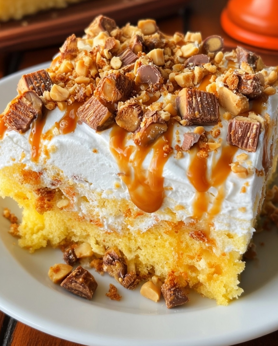 If you’re looking for a show-stopping dessert that’s incredibly easy to make and guaranteed to disappear fast, this Butterfinger Poke Cake is it. Moist yellow cake soaked with sweetened condensed milk, swirled with creamy peanut butter, topped with fluffy whipped cream, and finished with crunchy Butterfinger candy—every bite is rich, soft, and packed with texture.