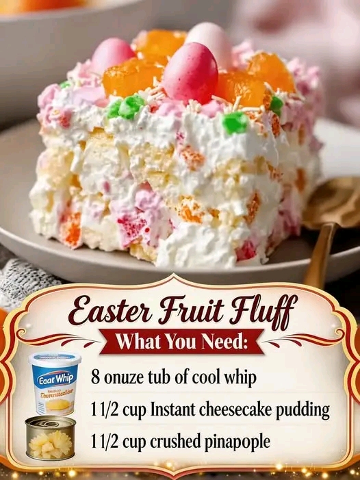 Easter Fruit Fluff Introduction This Easter Fruit Fluff is a cheerful, colorful dessert that brings joy to any spring celebration. It’s creamy, fruity, and filled with marshmallow sweetness — a …