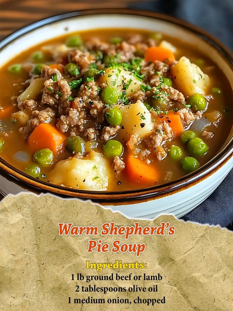 Warm Shepherd’s Pie Soup Introduction This Warm Shepherd’s Pie Soup takes all the cozy flavors of the classic casserole and transforms them into a hearty, comforting bowl. With savory ground …