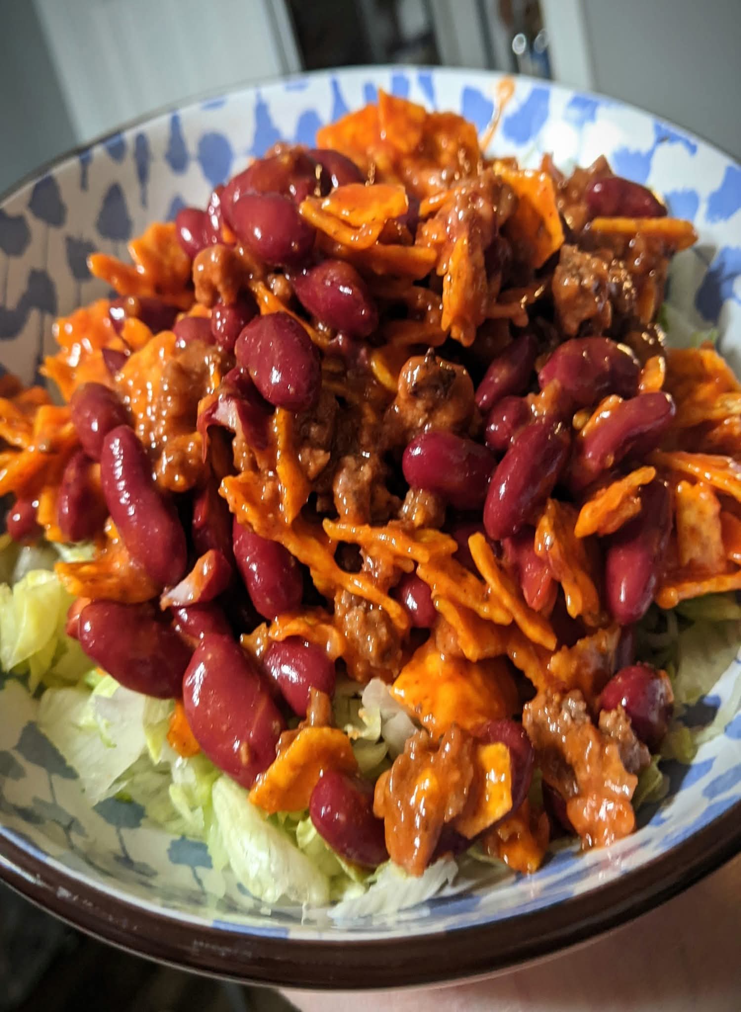 Serve immediately for maximum crunch, or wait a few minutes if you like softer Doritos. You can customize this salad with shredded cheese, diced tomatoes, chopped onions, or even a little sour cream. Ground turkey works as a lighter alternative, and spicy Doritos add an extra kick if you like heat.