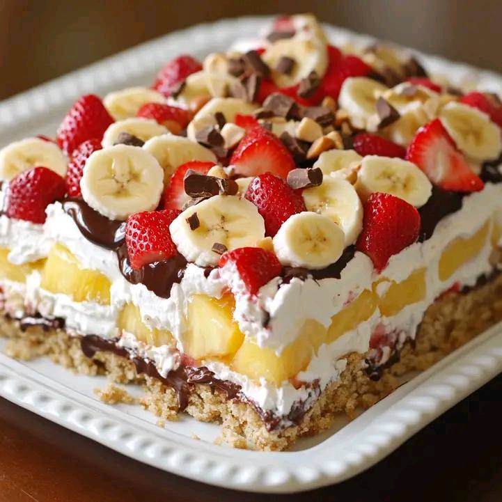 This Easy No-Bake Banana Split Cake delivers everything we want in a dessert: simplicity, flavor, texture, and presentation. With its buttery crust, luscious cheesecake filling, vibrant fruit layers, fluffy topping, and rich chocolate drizzle, it transforms the classic banana split into a sliceable masterpiece.