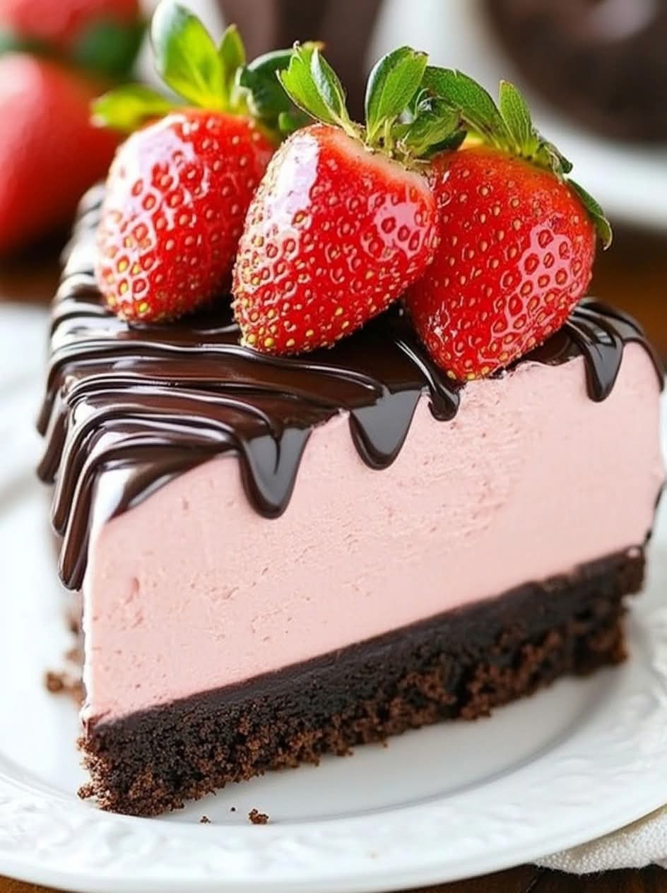 A decadent, show-stopping dessert that combines fresh strawberries, creamy cheesecake, and glossy chocolate perfection