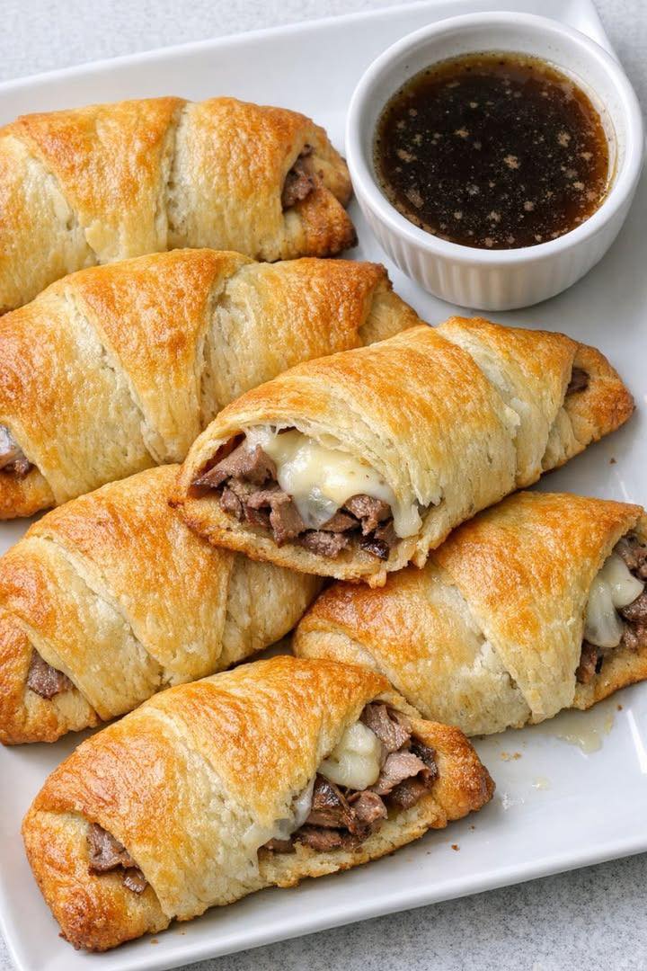 The magic of this recipe isn’t just the flaky crust or melty filling—it’s the au jus. Even though it’s made from simple beef broth, simmering it briefly concentrates the flavor into a rich, savory dip that ties everything together. Don’t skip it—it’s what transforms these from “good” to unforgettable.