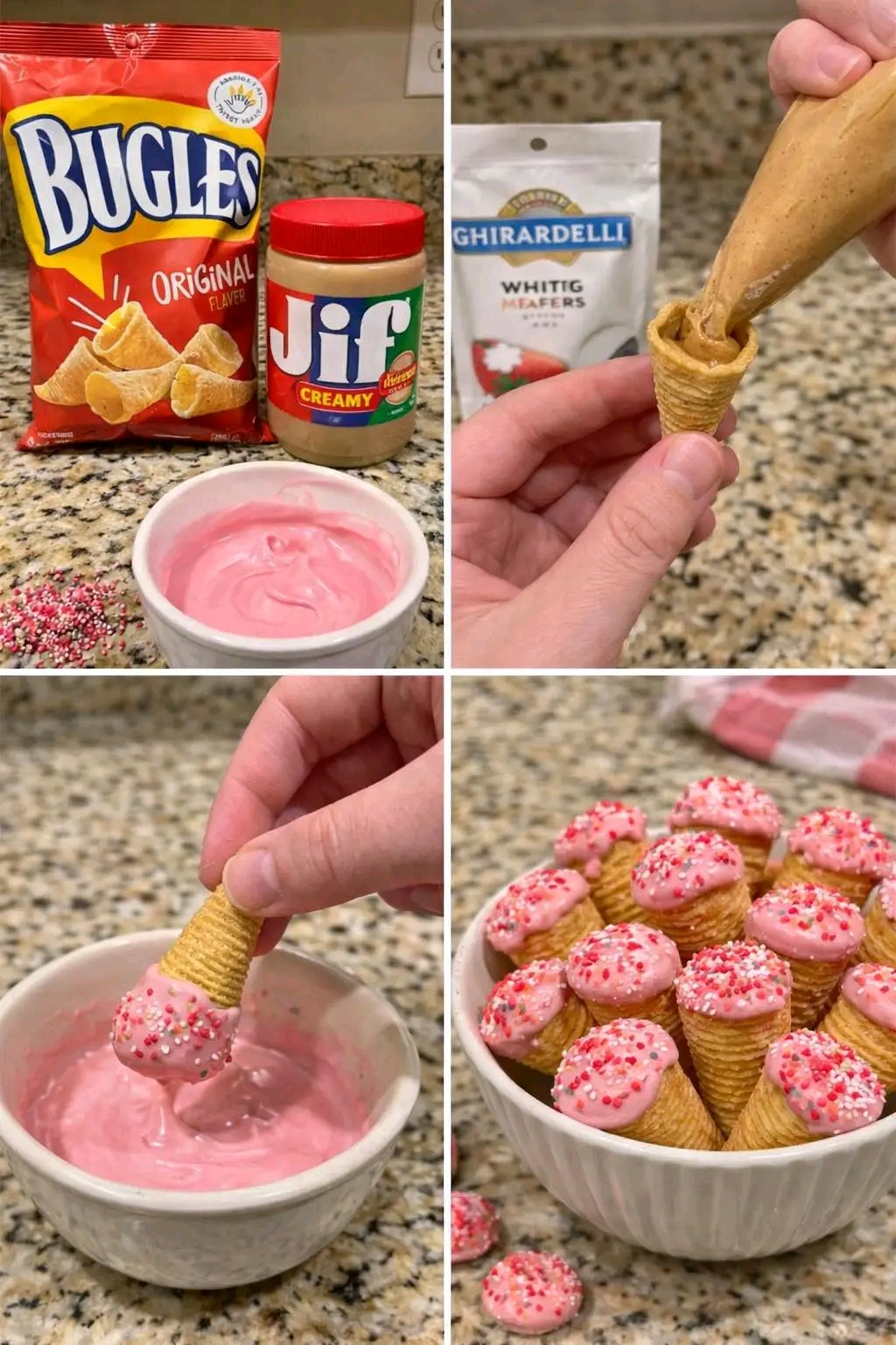 Bugles are one of those nostalgic snacks that instantly transport you back to childhood. Their unique cone shape makes them perfect for stuffing, and in this recipe, we transform them into Sweet Filled Bugles Bites: crunchy Bugles filled with creamy peanut butter, dipped in strawberry‑flavored coating, and topped with sprinkles. The result? A playful, party‑ready treat that’s as fun to make as it is to eat.