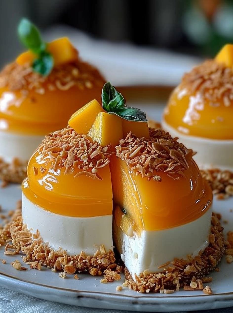 Tropical Mango Mousse Entremets with Thai Basil Cream Center & Toasted Coconut Biscuit Base