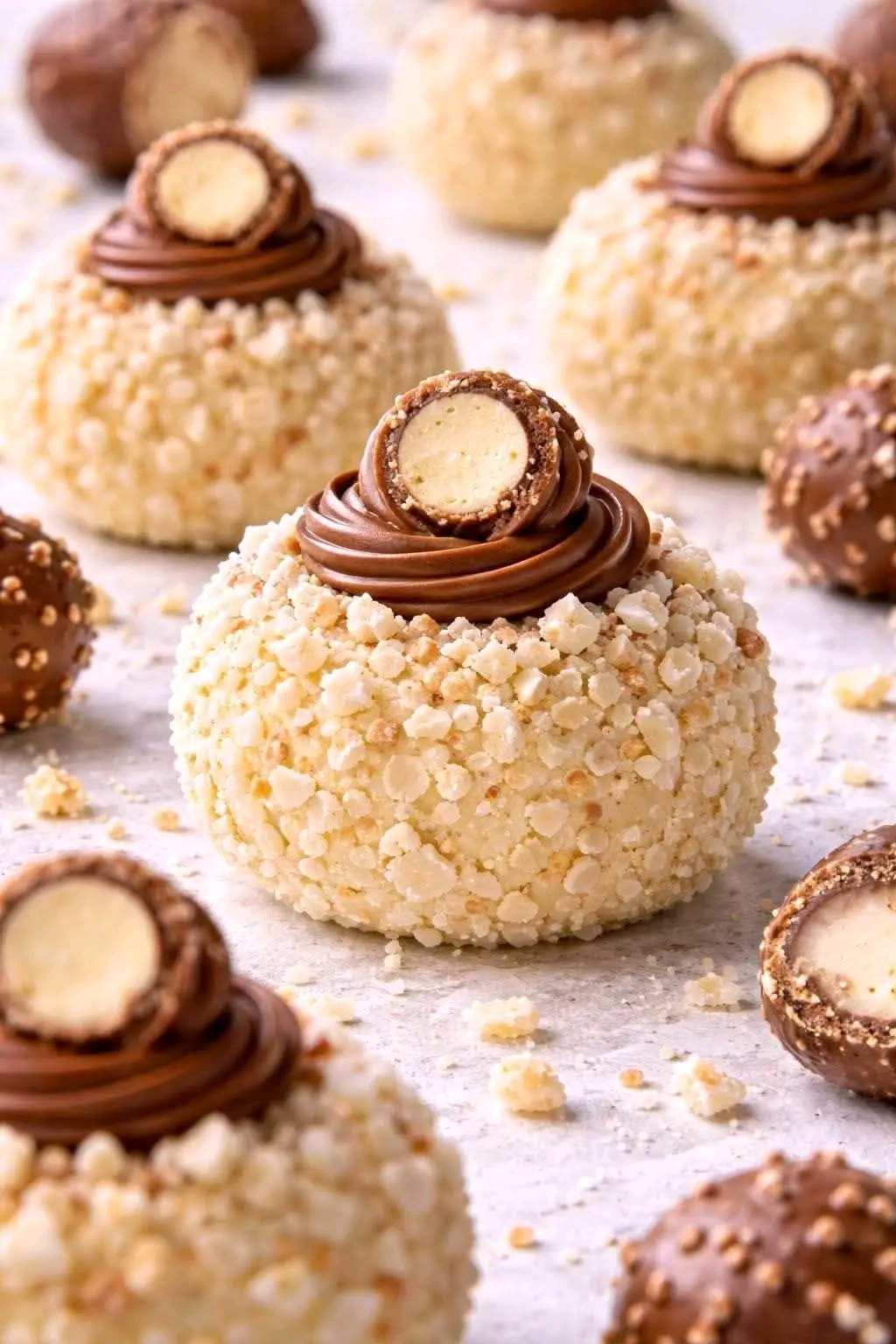 Roll in crushed nuts, white crunch, or chocolate shavings.